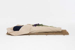 Een complete uitvaartset, bestaande uit de duurzame Bamboe baar en de Basic wade van biologisch molton.